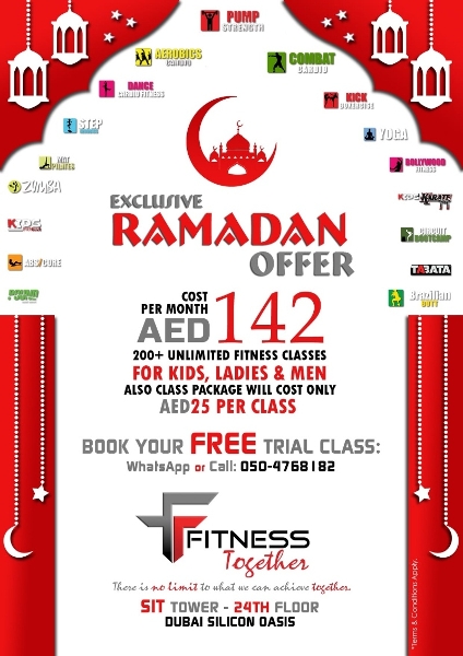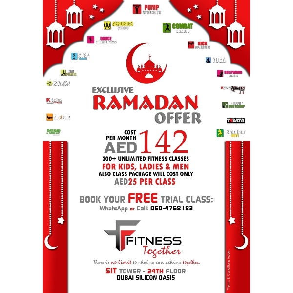 Exclusive Ramadan Offer! - Unlimited Fitness Classes monthly cost will be AED142 only. So you will get 12 months plus 2 months Freezing option so membership can be extended upto 14months without any contract with upfront payment so in only AED1999 ÷ 14 = AED142(Terms & Conditions applied) - 30 Classes Package will cost only AED25 per class so AED25x30=AED750 only (30 classes package validity is 6 months) Take extra advantage for this blessed month and join our Fitness Classes to get maximum results in Ramadan! It’s the best month to achieve maximum results you wish for! For info contact via WhatsApp at 0504768182 - SIT Tower - 24th Floor - Dubai Silicon Oasis. Ramadan Kareem! Stay healthy and may Allah bless you with joy, togetherness and happiness! I hereby agree to accept and abide by the terms of Fitness Together FZE Membership Application and Agreement. I understand that this membership minimum subscription agreement applies to chosen number of months/sessions, where the payment should be done in advance for the full period mentioned duration of the membership without any cancellation before the subscription expires. Should I not wish to renew the membership subscription and start a new cycle, 15 days notice will be given in order to terminate the membership renewal agreement. I hereby agree to join any Fitness Classes running in Fitness Together and I will not make Fitness Together responsible in the unfortunate case of any health issue or injury. IN WITNESS WHEREOF, THE PARTIES HERETO HAVE EXECUTED THIS AGREEMENT BY THEIR DULY ATHORIZED REPRESENTATIVES AS OF THE DATE.